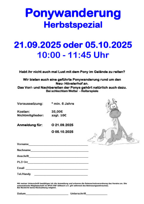 Auch wir starten heute in die Herbstferien. In der ersten Woche findet mit unserer Ponyferienfreizeit die schönste Art der Feriengestaltung statt. In der zweiten Ferienwoche starten wir mit einem intensiven Training für das große WBO-Turnier. Wir wünschen allen Teilnehmern eine unvergessliche Zeit mit den Pferden!